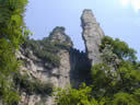 (花果山、水簾洞)孫悟空的花果山水簾洞到了。并不是張家界人過于牽強,胡亂把西游記的事兒往這兒湊,實在是巧合,《西游記》劇組的導游楊潔及唐僧、豬八戒、孫猴子、沙和尚等飾演者,一見到這地方就十分肯定地說:外景地選遍全國,只有張家界才真正是《西游記》筆下的神仙妖魔世界。大家順著我的指向往前看,左前方是帶著僧帽,披著袈裟,嘴中念念有詞的唐僧,緊跟在他后面的那座黑乎乎的石峰當然就是沙和尚了;神通廣大的孫猴子半蹲在唐僧后側手搭涼篷,正在觀察敵情呢;豬八戒哪去了?不用說,不是貪吃貪睡,就是偷偷找小女子搭訕去了,花心去了。