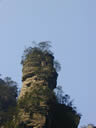 (亂竄坡)左邊這個坡,相傳向王天子兵敗后主力部隊從這里撤退上袁家界,進天子山。這時,官兵追上來了,埋伏上的士兵一刀砍斷葛藤,滾木擂石潮水般砸了下來,打得官兵四處亂竄,以后就把這個坡叫“亂竄坡”。從亂竄坡可以上著名風景游覽線袁家界,那里有后花園、迷魂臺、天下第一橋、天懸白練瀑布;還可以取道上天子山、進楊家寨。大家抬頭看,就是這座孤峰,叫羊寨,那里是一片原始森林。